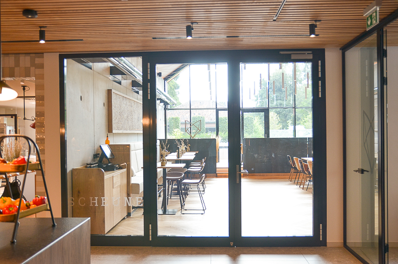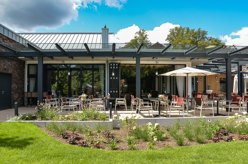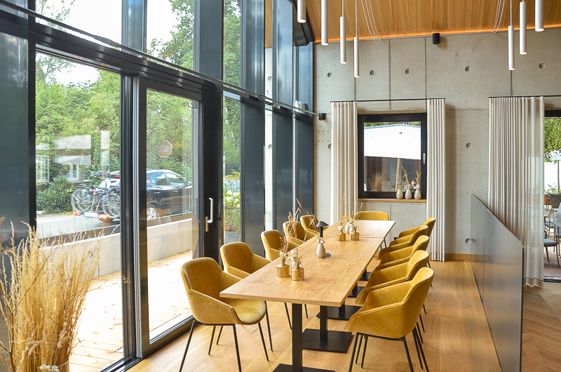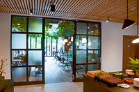 Neubau zweier Restaurants. 5- und 7-teilige Faltanlagen öffnen das "Pop-Up"-Restaurant nahezu vollkommen zur Terrasse und dem angrenzenden Park.